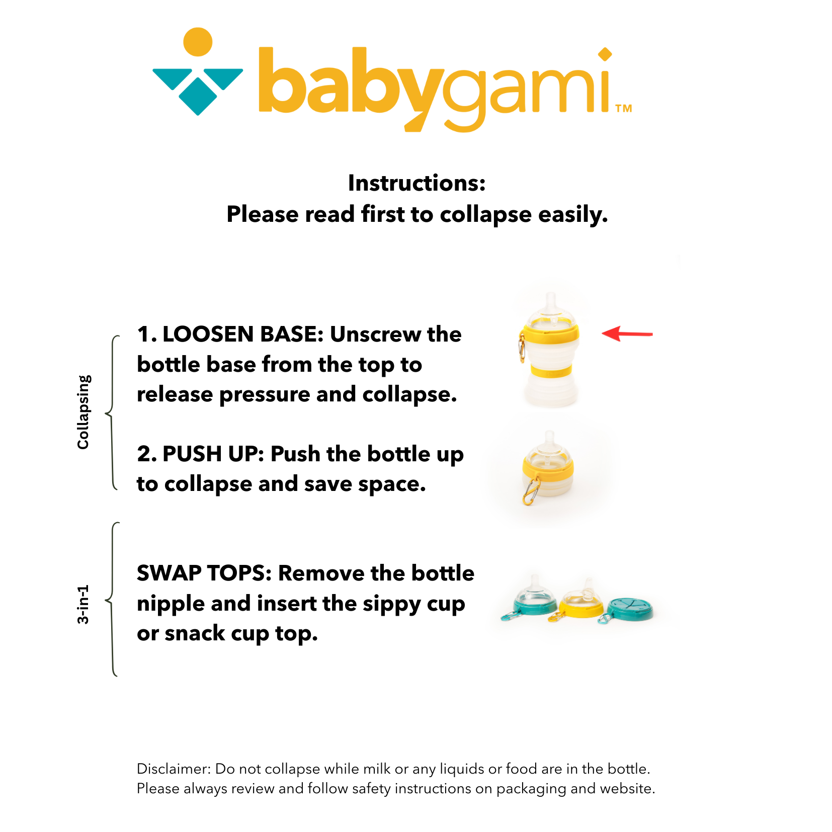 Congratulations on your purchase of the babygami® 3-in-1 baby bottle! This versatile and space saving product serves as a baby bottle, sippy cup, and snack cup, making it perfect for your growing child's needs. This manual will guide you through its features, usage, cleaning, and safety instructions.